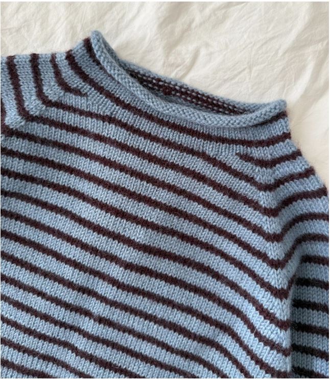 Frankie Sweater strikkes oppefra og ned med raglanudtagninger på bærestykket. Der strikkes vendepinde i nakken for at lave halsudskæring. Ærmerne strikkes rundt på strømpepinde eller rundpind. Frankie Sweater strikkes med smalle striber.