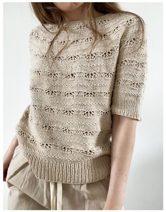 Musling Tee strikkes oppefra og ned. Efter halskanten strikkes vendepinde, så halsudskæringen bliver dybere foran end bag. Derefter strikkes det runde bærestykke, og krop og ærmer strikkes færdig for sig.